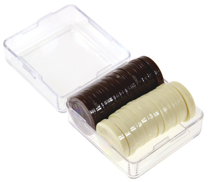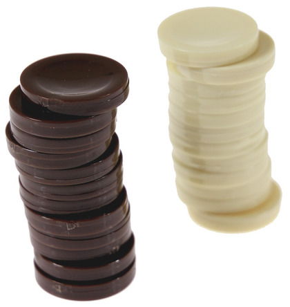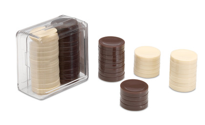 Plastikowe pionki do gry w "Warcaby", w kolorze brązowym i kremowym. Pionki umieszczone są w plastikowym przezroczystym pudełku. Średnica pionków - 25 mm.