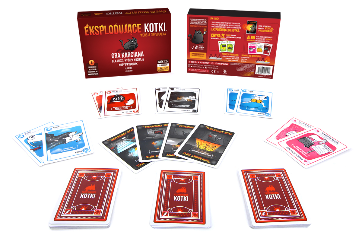 Sprawdź, na czym polega fenomen kultowej karcianki i spróbuj swoich sił w oszukiwaniu przeznaczenia! Eksplodujące Kotki to napędzana kociakami, całkowicie bezpieczna odmiana rosyjskiej ruletki. Podczas rozgrywek gracze co turę dobierają po jednej karcie, aż do momentu, gdy ktoś wyciągnie eksplodującego kotka – taki nieszczęśnik wybucha i ginie, a tym samym kończy grę. Na szczęście w talii są też karty, dzięki którym możemy odwlekać nieuniknione (a raczej przerzucić je prosto na przeciwników). Aby wygrać, musimy mądrze zarządzać kartami, które uda nam się zdobyć.