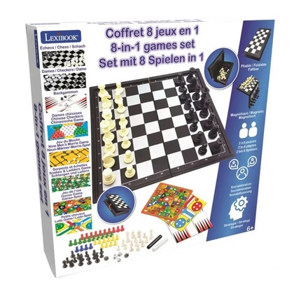 8 gier w zestawie: szachy, warcaby, młynek, węże i drabiny, gra w gęsi, ludo, chińskie warcaby i tryktrak.