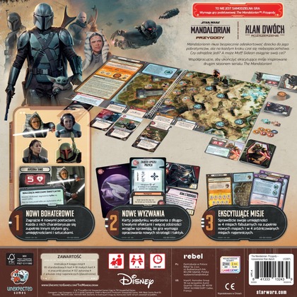 Mandalorianin musi bezpiecznie odeskortować dziecko do jego pobratymców, ale na każdym kroku czai się niebezpieczeństwo. Czy odnajdzie Jedi? A może to Moff Gideon osiągnie swój cel?   Współpracujcie, aby ukończyć ekscytujące misje w The Mandalorian: Przygody - Klan dwóch, rozszerzeniu inspirowanym drugim sezonem serialu o legendarnym łowcy nagród! Czekają na Was 4 misje fabularne na zupełnie nowych mapach oraz 4 zróżnicowane misje najemnicze. Wyzwaniem będą też karty pojedynku, wydarzenia z długotrwałymi efektami i większa liczba zdolności wrogów, dzięki którym gra będzie wymagała opracowania nowych strategii i taktyk. Na szczęście macie do dyspozycji 4 nowe postacie, z których każda charakteryzuje się zupełnie innym stylem, umiejętnościami i sztuczkami.   Czym jest The Mandalorian: Przygody?   To  angażująca gra inspirowana serialem o legendarnym łowcy nagród, w której wraz z przyjaciółmi wcielacie się w niego oraz jego sojuszników, by walczyć z wrogami i rozstrzygać rozmaite dylematy. Podczas zabawy będziecie mieli okazję zostać bohaterami, przeżywać niezapomniane przygody i poszerzać swoje horyzonty, odkrywając tajemnice świata Gwiezdnych Wojen A to wszystko po to, by zrealizować cele ekscytujących misji!