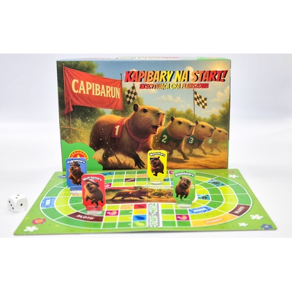 Rozgrywka jest prosta: rzucasz kostką i przesuwasz swoją kapibarę po torze. Ale uwaga – na trasie czekają różne niespodzianki! Błotniste pola mogą Cię spowolnić, sianko doda Ci energii, a woda przyspieszy Twój ruch. Może trafi się też relaks albo… natrętna mucha, która popsuje Twoje plany!