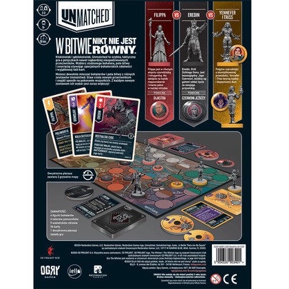 Unmatched to gra figurkowa o pojedynkach postaci z różnych krain i epok, od herosów znanych z mitów i legend, do bohaterów książek i filmów. Każdy z nich dysponuje własną talią kart, która wyraża jego wyjątkowy styl walki. Możesz mieszać i zestawiać bohaterów z dowolnych zestawów Unmatched, ale pamiętaj: ostatecznie zwyciężyć może tylko jeden!   Bohaterowie dostępni w tym zestawie: Filippa Eilhart - Czarodziejka i intrygantka, Yennefer i Tris - Lojalne przyjaciółki i odwieczne rywalki, Eredin - Król Dzikiego Gonu.