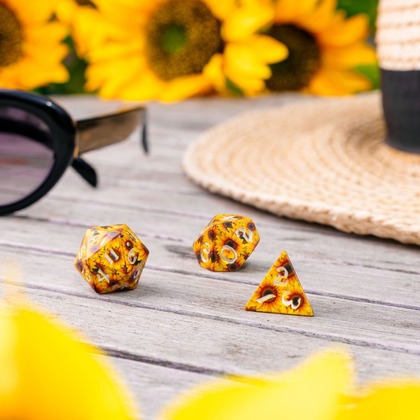 Jest takie miejsce, gdzie słońce nigdy nie zachodzi - nie dlatego, że wisi wysoko na niebie, lecz dlatego, że rozkwita na każdej ściance kostki. Słoneczniki wybuchają żywymi kolorami na każdym boku, a ich złote płatki rozciągają się ponad krawędziami, tworząc jedno, nieprzerwane pole w ruchu. To nie są zwykłe kostki. To skrawki wiecznego lata zaklęte w wielościanach.   Dzięki metodzie pełnokolorowego nadruku każda z kostek staje się miniaturowym obrazem - żywym, szczegółowym, nieustającym. Wzór naturalnie przechodzi z jednej ścianki na drugą, odzwierciedlając harmonię samej natury. W tym malowniczym krajobrazie wyróżniają się wyraźne cyfry w runicznej czcionce, łącząc funkcjonalność naszego najstarszego zestawu kości z czystym artyzmem nowego.   W zestawie znajdziesz 7 wielościennych kostek o niezrównanej jakości. Dopracowane, trwałe i przyciągające wzrok, są stworzone do częstego rzucania i nieskończonego podziwiania. Niezależnie od tego, czy jesteś graczem, kolekcjonerem, czy po prostu miłośnikiem piękna, te kostki oferują więcej niż mechanikę - oferują inspirację.