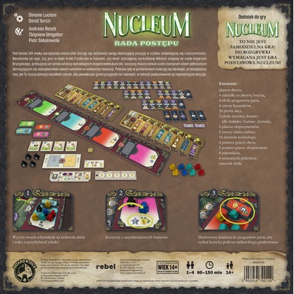 Pod koniec XIX wieku europejskie monarchie starają się zachować swoją dominującą pozycję w szybko zmieniającej się rzeczywistości. Niezależnie od tego, czy jest to dwór króla Fryderyka w Saksonii, czy starzejącej się królowej Wiktorii stojącej na czele Imperium Brytyjskiego, wszyscy muszą stawić czoła rosnącym siłom politycznym domagającym się zabezpieczenia swoich udziałów w nuklearnej rewolucji. Podczas gdy w parlamentach ścierają się ideologie, przedsiębiorcy tacy jak Ty muszą dołożyć wszelkich starań, aby powiększać grono przyjaciół na salonach, w których podejmowane są najważniejsze decyzje. Nucleum: Rada postępu to rozszerzenie wprowadzające nową planszę dworu przedstawiającą 4 partie polityczne: Kapitalistów, Wolnomyślicieli, Komunistów oraz Rojalistów. W ramach nowego rodzaju akcji gracze będą umieszczać swoich robotników na polach konkretnych partii dla natychmiastowych korzyści oraz szansy na dodatkowe zyski podczas królewskiego punktowania. Wśród komponentów znajdziemy też Eksperyment F, który możemy dołączyć do gry podstawowej niezależnie od reszty dodatku. Zawiera on 3 nowe elementy: płytki akcji wiązanych. Wszystkie zostają odblokowane przez technologię poziomu 3. eksperymentu F. UWAGA! Nowe elementy z rozszerzenia Rada postępu mogą być dodane do gry podstawowej lub z dodatkiem Nucleum: Australia. Czym jest Nucleum? To złożona gra o rozbudowie sieci przemysłowych wymagającą planowania i reagowania na dynamicznie zmieniającą się sytuację na mapie. Podczas rozgrywek walczymy o tytuł najlepszego przemysłowca epoki nowej energii i stajemy na czele frakcji starających się zaspokoić ambicje króla. W każdej turze zagrywamy płytkę akcji na swoją planszę albo na mapę, albo przeprowadzamy doładowanie. Dzięki temu możemy łączyć miasta, aby stawiać i zasilać budynki za pomocą nucleum oraz uranu z wybudowanych przez siebie kopalni.