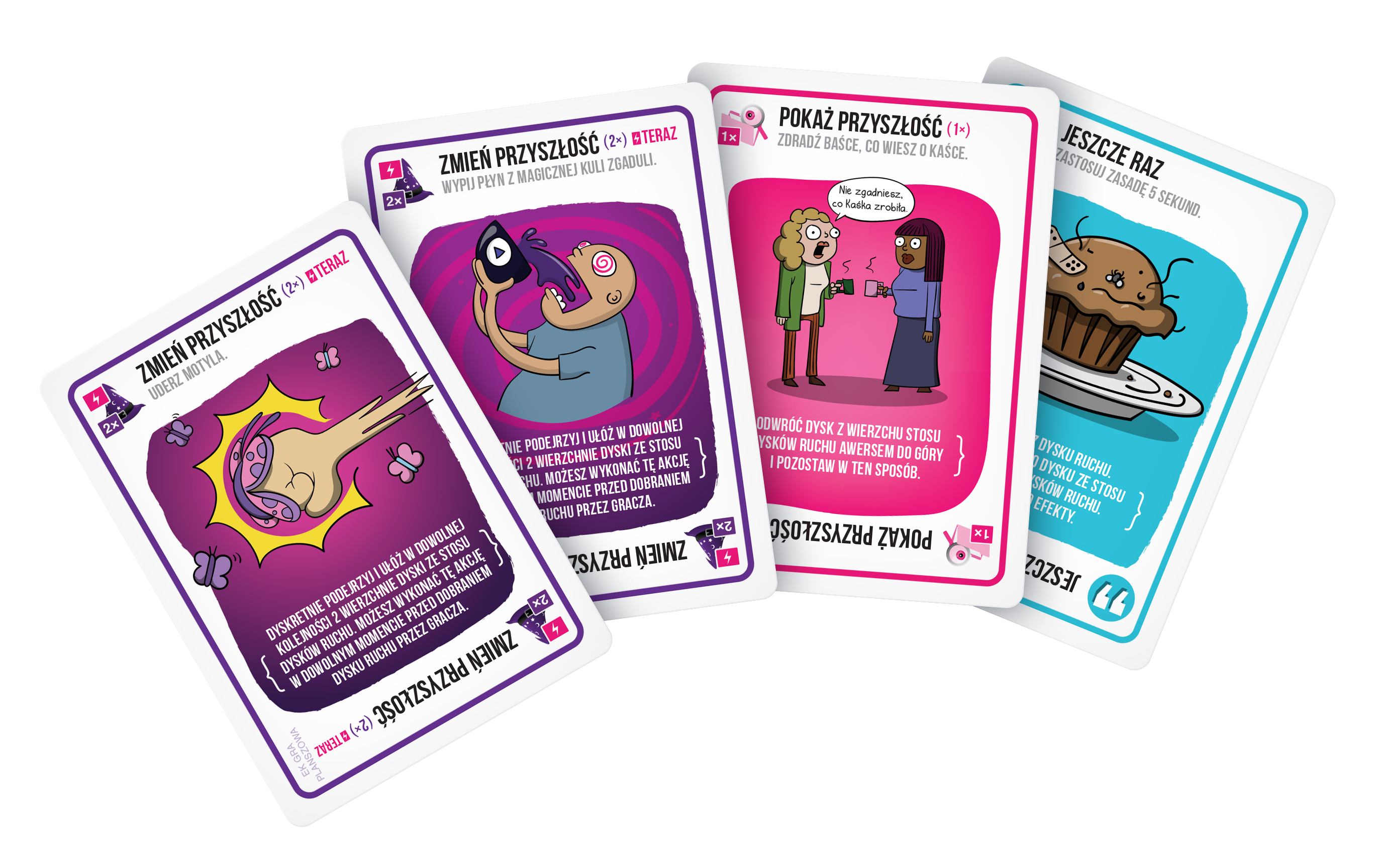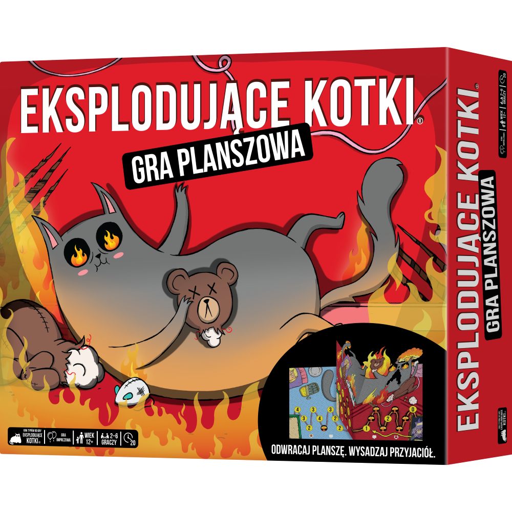 Jedna z najlepiej sprzedających się gier karcianych wszech czasów jest teraz planszówką i to taką, jakie świat jeszcze nie widział! Eksplodujące Kotki: Gra planszowa to nowa wersja imprezowego hitu, w którym próbujemy odnaleźć się w zmiennej sytuacji i zastawiać przemyślane pułapki na przyjaciół. Znajdziemy tu zarówno znajome efekty, jak i zupełnie nowe rozwiązania, a wybuchnięcie może okazać się całkiem kuszącą opcją Na czym to polega? Podczas rozgrywek naszym celem jest zakończenie ruchu dokładnie na polu ze wstążką. Wydawać by się mogło, że do pokonania mamy niewielki odcinek, ale wszechobecne pułapki i przeciwnicy będą nam skutecznie utrudniali planowanie. Gracze kolejno rozgrywają swoje tury w ramach identycznego schematu: najpierw zagrywamy dowolną liczbę kart akcji z ręki, a potem dobieramy dysk ruchu i go rozpatrujemy. O ile talia kart nie stanowi zagrożenia i jest pełna przydatnych efektów, o tyle dyski ruchu potrafią nieźle namieszać w naszych planach. Skoro gra ma w nazwie eksplodujące kotki, nie powinno dziwić, że udział w niej wiąże się z ryzykiem wybuchnięcia. Jeśli trafimy na pole ze znajomą pułapką, musimy zagrać kartę rozbrojenia. W przeciwnym razie eksplozja wyrzuci nas prosto do kuwety (czyli na pole startowe). Jeszcze Wam mało? Dodajmy, że plansza jest dwustronna w trybie spokoju czekają na nas tylko 3 eksplodujące kotki, jednak w trybie chaosu jest ich aż 9! Na szczęście mamy pewną kontrolę nad tym, czy i kiedy zmieniamy stronę podobnie jak pozostali gracze, którzy z pewnością będą chcieli zrobić nam na złość. Dlaczego pokochasz tę grę? Fani Eksplodujących Kotków z pewnością docenią charakterystyczny humor, obejmujący zarówno teksty na kartach, jak i ilustracje. Poczują się też pewniej widząc znajome efekty, nawet jeśli tym razem będą ich używać w nieco innym celu. Jednocześnie gra jest na tyle zmodyfikowana, że będzie interesująca nawet dla weteranów serii. W planszowej wersji unikanie wybuchnięcia nie jest naszym głównym celem (ba, czasem może nawet okazać się przydatne!), musimy więc przyjąć zupełnie inną strategię. Podczas rozgrywek nie zabraknie jednak najważniejszego: negatywnej interakcji! Praktycznie każdy element gry, od efektów kart, poprzez dyski ruchu, aż po odwracanie planszy, można wykorzystać, by uprzykrzyć życie kolejnemu graczowi.