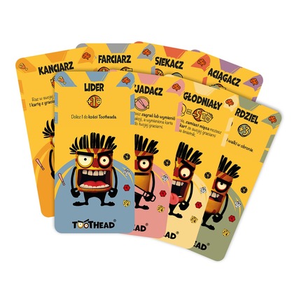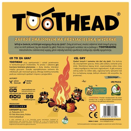 Witaj w świecie, w którym wszyscy chcą Cię zjeść! Żeby przetrwać, musisz odpierać ataki innych graczy oraz na nich polować, by nie dopadł Cię głód. Podczas rozgrywki wcielasz się w jednego z Tootheadów - mieszkańców zaśmieconej wyspy, gdzie odpady ludzkiej cywilizacji podsycają zajadłą egzystencję.   Toothead uczy asertywności i sztuki przetrwania w konkurencyjnym środowisku. To prosta i zabawna gra karciano-kościano-planszowa z dużą dawką interakcji między graczami. Została zaprojektowana zarówno dla młodszych, jak i starszych graczy, oferując świetną rozrywkę podczas rodzinnych spotkań i imprez z przyjaciółmi.   Cel gry: Zjadać innych i samemu nie dać się zjeść... Gra kończy się zwycięstwem gracza, który jako jedyny zostanie przy stole. Skombinuj lepszą broń, wyprowadzaj celne ciosy i nękaj współgraczy niecnymi zagrywkami. A gdy wszyscy ostrzą sobie na Ciebie zęby, zagrywaj karty specjalne lub licz na łaskawą wyspę. Jednym słowem rób wszystko, by przetrwać.   Pierwsze wydanie gry Toothead to edycja kolekcjonerska, która obejmuje plastikowy insert, karty w jakości premium, uszlachetnienia druku oraz unikatową kartę specjalną PINIATA.