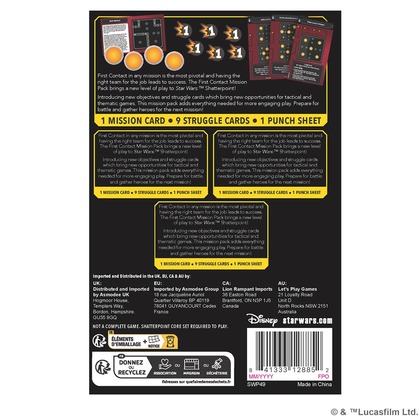Star Wars: Shatterpoint - First Contact - Mission Pack to rozszerzenie wprowadzające do gry nową misję oraz 9 nowych kart walki podzielonych na 3 fazy.   Czym jest Star Wars: Shatterpoint?   To pojedynkowa gra figurkowa dla 2 osób, w której przejmujemy kontrolę nad kultowymi postaciami z galaktyki Star Wars i ich sojusznikami, walcząc ze sobą o to, kto pierwszy osiągnie cele misji. Zbuduj swoją drużynę, rzuć wyzwanie przeciwnikom i rozegraj mnóstwo ekscytujących bitew, które przesądzą o losach galaktyki! Pamiętaj, że najlepsi dowódcy to ci, którzy szybko przystosowują się do sytuacji pośród chaosu bitwy i korzystają z dobrodziejstw Mocy.