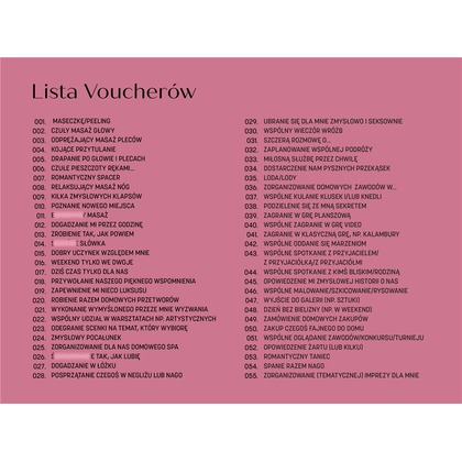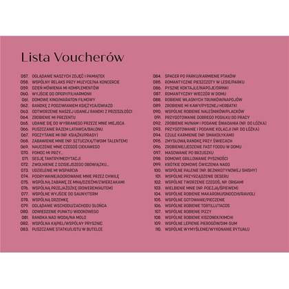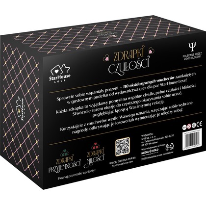 Chcecie okazywać sobie uczucia w niezwykły, zaskakujący sposób? Zacznijcie od teraz! Zapewnią Wam to vouchery, które zainspirują Was do wspólnych miłych gestów i działań. Dzięki nim odżywicie i ożywicie drzemiące w Was pokłady pozytywnych uczuć. Zdrapki czułości można odkrywać losowo, wręczać sobie wzajemnie tylko wybrane lub wymieniać je ze sobą. Wszystko zależy jedynie od Was! Czułość to coś, o czym czasem zapominamy, ale stanowi ona fundament każdej udanej relacji. Im więcej okażecie sobie czułości i zrozumienia, tym większa szansa na szczęśliwy związek dający spełnienie. Skorzystajcie ze Zdrapek czułości już dziś! W gustownym opakowaniu czeka na Was 110 unikalnych, skrywających nagrody voucherów, którymi obdarzycie siebie nawzajem! To wysokiej jakości produkt, stworzony przez ekspertów specjalizujących się w grach dla par od 15 lat! Okazywanie sobie czułości na rozmaite sposoby nigdy nie było tak proste i łatwe, jak teraz! Jednym z fundamentów każdej relacji jest zapewnianie sobie pozytywnych emocji oraz obdarzanie się ciepłymi uczuciami. Wystarczy, że wylosujecie kilka Zdrapek czułości, odkryjecie, co skrywają i podążycie za zawartymi na nich sugestiami! Zdrapki czułości: Zamienią drobne gesty w wielkie, pozytywne emocje. Pomogą Wam nagradzać się każdego dnia za to, że jesteście! Zapewnią każdemu z Was miłe, dające radość niespodzianki Dodadzą Waszym wspólnym chwilom ciepła i bliskości. Wesprą Was w komunikowaniu Waszych emocjonalnych pragnień. Zainspirują Was do czułych zbliżeń. Wzmocnią w Was zdolność i chęć do celebrowania razem wspólnych chwil. Dla kogo są Zdrapki czułości? Dla tych, którzy pragną zrobić komuś bliskiemu inspirujący prezent. Dla osób, dla których okazywanie sobie czułości i uczuć jest ważne. Dla relacji, które budują swoją więź w oparciu o życzliwość, zrozumienie i miłość. Dla par, które chcą czerpać satysfakcję z relacji każdego dnia. Dla związków, w których partnerzy pragną celebrować i wzmacniać łączące ich uczucie.