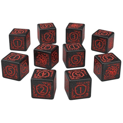 Zanurz się w dziedzictwie Valyrii z oficjalnym zestawem kości inspirowanym rodem Targaryenów!   Dziesięć sześciokątnych kości D6 lśni czernią z dodatkiem brokatu, a czerwone grawery przyciągają wzrok i rozpalają wyobraźnię. Na ściankach znajdziesz wszystko, co definiuje Targaryenów: potężny herb z trójgłowym smokiem oraz złowrogą dewizę Fire and Blood. To idealny wybór dla fanów Gry o Tron, którzy w grze stawiają na siłę, ambicję i odrobinę ognistej charyzmy.    Kości świetnie sprawdzą się zarówno podczas sesji RPG, jak i jako wyjątkowy element kolekcji każdego fana sagi.
