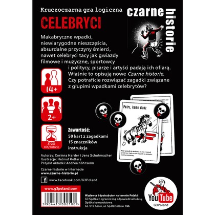 Makabryczne wpadki, niewiarygodne nieszczęścia, absurdalne przyczyny śmierci, nawet celebryci tacy jak gwiazdy filmowe i muzyczne, sportowcy i politycy, pisarze i artyści padają ich ofiarą. Właśnie to opisują nowe Czarne historie. Czy potraficie rozwiązać zagadki związane z głupimi wpadkami celebrytów?