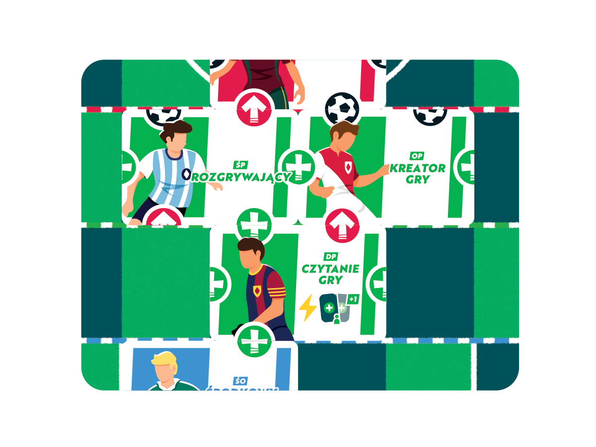 Twoja Magiczna Jedenastka to innowacyjna gra sportowa przedstawiająca taktyczną konfrontację meczu piłki nożnej z prostymi zasadami. Jest to gra dla 2 graczy, w której każdy z nich wciela się w trenera drużyny piłkarskiej, aby poprowadzić swoją drużynę do zwycięstwa. Mecz rozgrywa się w dwóch rundach (1. i 2. połowie), a każda runda składa się z kilku tur. W swojej turze gracz umieszcza Kartę Zawodnika na planszy boiska. Umieszczenie Karty Zawodnika oznacza, na czym obecnie skupia się drużyna i który zawodnik jest centralną postacią taktyki. Każda Karta Zawodnika ma półokrągłe symbole taktyczne, które można łączyć z symbolami na innych Kartach Zawodników. W związku z tym, w miarę upływu czasu, każda drużyna będzie miała więcej symboli taktycznych w zależności od kombinacji Kart Zawodników. Istnieją 4 różne rodzaje symboli taktycznych - Atak, Obrona, Podanie i Pressing - a akcja i efekt, które możesz wykonać w swojej turze, różnią się w zależności od rodzaju i liczby symboli, które posiadasz. W zależności od posiadanych symboli taktycznych możesz: 1) wykonać strzał, 2) dobrać Karty Synergii lub 3) przesunąć Znacznik Kontroli na Torze Kontroli. Kiedy wykonujesz strzał, porównaj swoją siłę ataku z siłą obrony przeciwnika. Siłę ataku i obrony można wzmocnić za pomocą Kart Synergii, które posiada każdy gracz. Karty Synergii reprezentują pracę zespołową i podania w drużynie. Jeśli kontrola jest wystarczająco wysoka, możesz dodać więcej Kart Synergii do siły ataku. Jeśli suma siły ataku jest wyższa niż siła obrony, w rezultacie pada gol! Jeśli suma siły ataku wynosi dokładnie 11, nazywa się to Magiczną Liczbą lub bramką Stadiony Świata, więc przeciwnik nie może obronić strzału, nawet mając wyższą siłę obrony. Z drugiej strony, jeśli przekroczy 11, zawsze nie ma bramki, ponieważ strzał był zbyt silny i poszybował daleko ponad poprzeczką. Ponieważ zawsze losuje się z talii co najmniej jedną Kartę Synergii, nie można zagwarantować wyniku strzału! Runda kończy się, gdy skończą się wszystkie Karty Synergii.