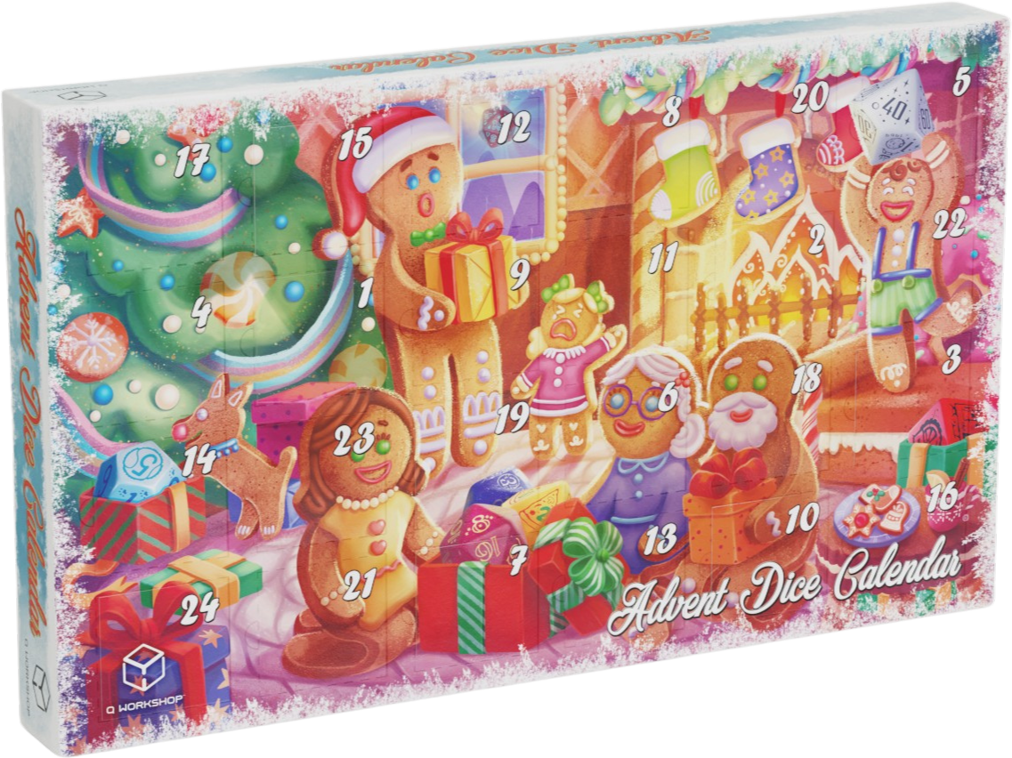 Święta coraz bliżej! Rozpoczynamy odliczanie do Bożego Narodzenia! Magia świąt zaczyna się od małych rytuałów - a jednym z nich jest codzienne otwieranie kolejnych okienek aż do Wigilii. Z Kostkowym Kalendarzem Adwentowym każdy dzień grudnia stanie się przygodą! Tym razem zajrzysz do piernikowego domu, w którym rodzina lukrowanych ludzików przygotowuje się do świąt. W każdym okienku kryje się wyjątkowa niespodzianka, która rozświetli Twoją kolekcję i stół do gry.   Rozpakuj 24 niespodzianki zamknięte wewnątrz przepięknego kalendarza - w 23 okienkach czekać będą fantastyczne kości stworzone przez Q-Workshop, a na zakończenie w ostatnim okienku - metalowa niespodzianka!   Zanurz się w świecie unikalnych wzorów oraz przepięknych kolorowych kości. Spraw sobie mały prezent każdego dnia!   Advent Dice Calendar 2025 to:   kalendarz wykonany z kartonu w kolorze, z plastikową wypraską wewnątrz. 15 losowo wybranych kości spośród najpopularniejszych wzorów Q-Workshop, w różnych rodzajach i kolorach. 8 kości Zestawu Świątecznego (dodatkowa kość K4 Modern w zestawie), w nowej ekskluzywnej odsłonie. specjalna metalowa niespodzianka na ostatni dzień kalendarza
