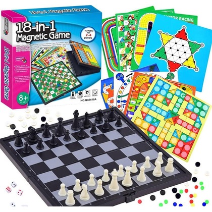 Magnetyczny Zestaw Gier Planszowych - Rozrywka na Długie Godziny! Przedstawiamy fantastyczny, wszechstronny zestaw gier planszowych, który zapewni rozrywkę dla całej rodziny i przyjaciół. Ten kompaktowy zestaw "18-w-1" to idealne rozwiązanie na długie wieczory, wakacyjne wyjazdy czy spotkania towarzyskie, łączące w sobie klasyczne i popularne gry w jednym, poręcznym opakowaniu. Główne cechy produktu: 18 gier w jednym: Zestaw zawiera szeroki wybór plansz i elementów, które pozwalają na grę w 18 różnych, klasycznych tytułów, takich jak szachy, warcaby, chińczyk, a także wiele innych, co gwarantuje, że każdy znajdzie coś dla siebie. Magnetyczne plansze i pionki: Wszystkie elementy do gry są magnetyczne, co zapobiega ich przypadkowemu przesuwaniu się lub gubieniu, nawet podczas podróży. Kompaktowa konstrukcja: Cały zestaw jest zaprojektowany jako poręczne, składane pudełko, które łatwo spakować i zabrać ze sobą w każde miejsce. Plansze są wymienne, co pozwala na szybkie przejście do kolejnej gry. Wysoka jakość wykonania: Elementy są trwałe i estetycznie wykonane. W zestawie znajdują się plansze, figurki szachowe i warcabowe, kolorowe pionki, kostki do gry oraz plansze do różnych gier. Dla każdego: Zestaw przeznaczony jest dla 2 lub więcej graczy i rekomendowany dla osób w wieku 8+, co czyni go doskonałym wyborem zarówno dla dzieci, jak i dorosłych. Edukacja i zabawa: Gry planszowe rozwijają myślenie strategiczne, logiczne, uczą cierpliwości i rywalizacji, a także są świetnym sposobem na spędzanie czasu razem. Wielkość opakowania: 23x24x4 cm Ten magnetyczny zestaw gier to idealny prezent dla miłośników planszówek i doskonały sposób na oderwanie się od ekranów, w zamian oferując klasyczną, angażującą rozrywkę. Spakuj go na urlop i ciesz się grą w dowolnym miejscu!