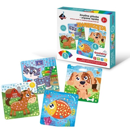 W zestawie są 4 obrazki, na które w odpowiednie miejsca należy nakleić piankowe elementy w kształcie kółka, kwadratu czy trójkąta, aby stworzyć piękne dzieło.