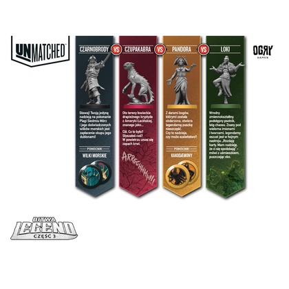 Unmatched to gra figurkowa o pojedynkach postaci z różnych krain i epok, od herosów znanych z mitów i legend, do bohaterów książek i filmów. Każdy z nich dysponuje własną talią kart, która wyraża jego wyjątkowy styl walki. Możesz mieszać i zestawiać bohaterów z dowolnych zestawów Unmatched, ale pamiętaj: ostatecznie zwyciężyć może tylko jeden!   Bohaterowie dostępni w tym zestawie: Czarnobrody - charyzmatyczny i przerażający pirat, Loki - nordycki bóg psotników, Pandora - zesłana przez bogów na ziemię z puszką pełną nieszczęść, Czupakabra - legendarny "wysysacz kóz", bezwzględny zabójca.