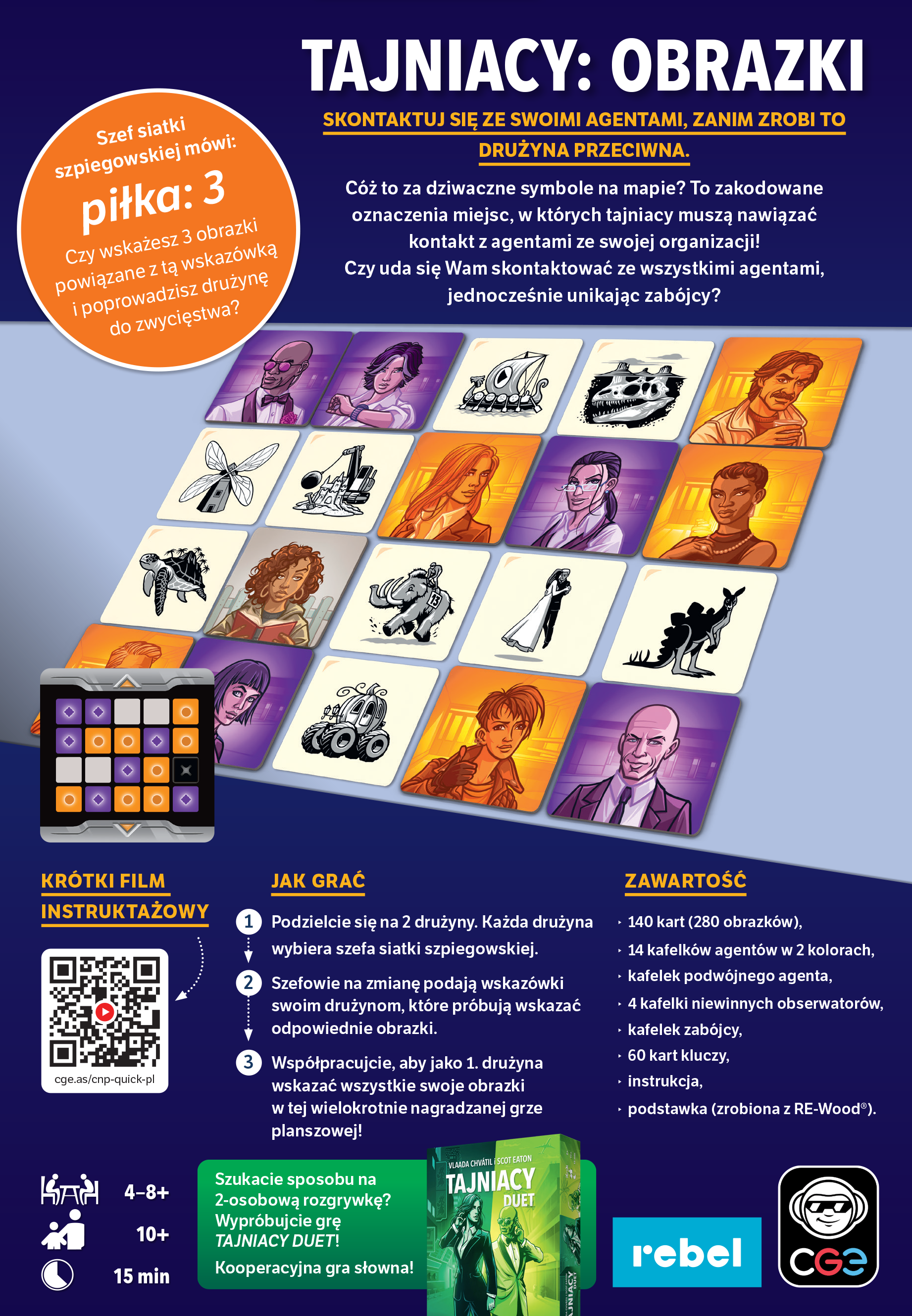 Dwie drużyny tajniaków, którym przewodzi dwóch Szefów Wywiadu, próbują jak najszybciej nawiązać kontakt ze wszystkimi swoimi agentami. Problem polega na tym, że Szefowie mogą przekazywać tylko po jednej wskazówce na raz, a możliwych kryptonimów jest naprawdę całkiem sporo. Co więcej, są wyrażone obrazkami, a nie słowami! Drużyna musi dokładnie przeanalizować wszystko, co powie ich przywódca. Zwłaszcza że gdzieś w mroku czai się zabójca Tajniacy Obrazki to alternatywna wersja imprezowej gry dedukcyjnej, która podbiła serca graczy na całym świecie. Podczas rozgrywek naszym zadaniem jest wymyślanie i odgadywanie skojarzeń do wieloznacznych grafik. Oferuje szansę wcielenia się w dwie różne role (podpowiadającego i odgadującego) oraz perfekcyjnie łączy współpracę (wewnątrz grupy) z rywalizacją (z drugą drużyną). Na czym to polega? Gracze dzielą się na dwie możliwie równe drużyny. W każdej rozgrywce na stole rozkładamy 20 kart z obrazkami tak, by tworzyły siatkę 4x5. Drużyny wyłaniają Szefów Wywiadu, którzy siadają razem po jednej stronie stołu. Przez całą grę Szefowie Wywiadu mają dostęp do specjalnego klucza, wskazującego które obrazki należą do danej drużyny, które są neutralne, a pod którym czai się zabójca. Zadaniem Szefów Wywiadu jest wymyślanie podpowiedzi i przekazywanie ich grupie. Ale uwaga, muszą być złożone z pojedynczych wyrazów! Cała sztuka tkwi więc w tym, by jednym hasłem połączyć jak najwięcej kryptonimów, a jednocześnie zadbać, by nie kojarzyły się z obrazkami przypisanymi do wrogich agentów. Razem ze wskazówką Szef podaje też liczbę wskazującą, ile kryptonimów połączył. Gdy Szef Wywiadu przekaże hasło, drużyna musi zdecydować, który obrazek lub obrazki ich zdaniem miał na myśli. W tym celu jej członkowie mogą dyskutować, a ich decyzja powinna być wspólna. Tajniacy zawsze muszą spróbować zgadnąć przynajmniej jeden kryptonim. Każdy zły strzał natychmiast kończy turę, jednak jeśli odkryją własnego agenta, mogą próbować dalej. Liczba dostępnych prób jest zależna od liczby podanej wraz z hasłem przez Szefa Wywiadu (zawsze mamy jedną próbę więcej). Gra kończy się w momencie, gdy zostanie odkryty ostatni agent danej drużyny lub gdy któraś drużyna odkryje zabójcę (w takim wypadku automatycznie przegrywa). Dlaczego pokochasz tę grę? Tajniacy oferują niezwykłe podejście do zabawy skojarzeniami. Łączenie losowych obrazów za pomocą luźnych myśli to nie lada wyzwanie! Twórcy gry zadbali, by grafiki były wieloznaczne, co dodatkowo utrudnia zadanie i skutkuje mnóstwem śmiechu i emocji. Podczas rozgrywek mamy okazję wcielić się w niesymetryczne role. Szefowie Wywiadu muszą nie tylko wymyślać kreatywne skojarzenia, ale też zachować kamienną twarz, gdy drużyna snuje swoje przemyślenia. Z kolei drużyna musi przeprowadzić skuteczną burzę mózgów i na tej podstawie podjąć decyzję. Co za odpowiedzialność! W grze mamy do dyspozycji aż 280 unikalnych obrazków, z których losujemy 20 i układamy w przypadkową siatką. Do tego dochodzą karty kluczy, jeszcze bardziej randomizujące rozgrywkę. Słowem: każda partia to inny układ i zupełnie nowe wyzwanie!