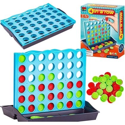 Zasady gry: Gra przeznaczona jest dla dwóch osób. Każdy gracz otrzymuje zestaw żetonów w jednym kolorze (czerwonym lub zielonym). Na zmianę wrzucacie po jednym żetonie do pionowej planszy. Waszym celem jest ułożenie czterech swoich żetonów w rzędzie - pionowo, poziomo lub na skos - zanim zrobi to przeciwnik.