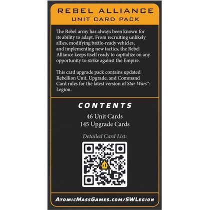 Zestaw Rebel Alliance - Unit Card Pack zawiera zaktualizowane karty jednostek i ulepszeń dla frakcji Rebel Alliance, zgodnie z najnowszymi zasadami gry Star Wars: Legion.   Kluczowe cechy: Aktualizuje wszystkie wcześniej wydane karty jednostek Rebel (Rebel Alliance Corps, Special Forces, Support oraz Heavy) oraz karty ulepszeń specyficzne dla frakcji, zgodnie z najnowszymi zasadami. Niezbędny zestaw dla graczy chcących zastąpić i uaktualnić swoje karty jednostek rebelianckich do najnowszych wersji. W zależności od liczby posiadanych figurek możesz potrzebować 1-2 zestawów. Każdy zestaw zawiera karty pokrywające połowę pełnej armii rebelianckiej (zaokrąglone w górę). Do gry potrzebny będzie również zestaw Rebel Alliance - Command Card Upgrade Pack (SWQ155), aby zaktualizować wszystkie karty. Dla pełnej kolekcji odświeżonych kart zalecane są również zestawy: Battle Cards Card Pack (SWQ125) oraz Upgrade Card Pack (SWQ144).