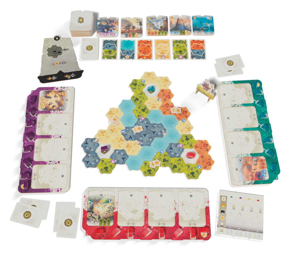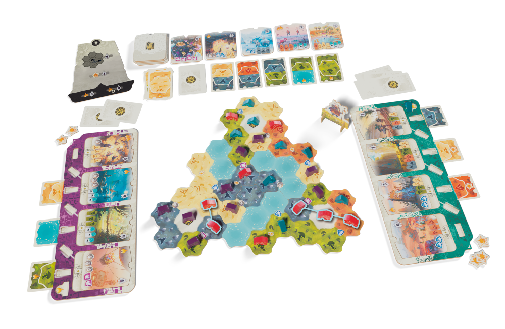 Wstaje nowy dzień, a nasze zasoby maleją. Zdecydowaliśmy się zwinąć obóz i wyruszyć w nieznane w poszukiwaniu lepszego jutra. Czy to w zakolu rzeki, czy w sercu gór wszędzie będziemy szukać brakujących nam surowców. Przemierzając lasy i pustynie, będziemy strzec drogocennego ognia, który daje nam ciepło i oświetla drogę. Nie ustąpimy w obliczu rosnącego nacisku ze strony sąsiednich plemion napiszemy swoją historię za wszelką cenę. Dewan to dynamiczna, rywalizacyjna gra strategiczna łącząca rozmieszczanie obiektów z zarządzaniem ręką oraz elementami wyścigu. Podczas rozgrywek decydujemy, które karty terenów chcemy wziąć na rękę, a następnie wykorzystujemy je, by umieszczać swoje obozy w kluczowych regionach, zanim zrobią to przeciwnicy. Aby wygrać, musimy sprytnie wykorzystywać ukształtowanie terenu i realizować cele, a zbieranie jagód i opanowanie sztuki ognia zapewni nam dodatkowe punkty zwycięstwa. Na czym to polega? W każdej rundzie gracze rozgrywają po 1 turze. W ramach tury mogą wziąć 2 karty albo umieścić obóz. Każda karta terenu jest podzielona na 2 części reprezentujące konkretne tereny (mogą być identyczne) i umożliwia przemieszczanie się po odpowiadających im obszarach. Oprócz tego karty mogą też mieć specjalne symbole. Jeśli zdecydujemy się na dobieranie, bierzemy 2 odkryte karty sąsiadujące ze sobą w specjalnym rzędzie. Drugim rodzajem akcji jest umieszczenie obozu. W tym celu wybieramy 1 z naszych obozów na planszy oraz dowolne puste pole, które będzie naszym polem docelowym. Następnie wskazujemy pola, które chcemy minąć, by dotrzeć do pola docelowego. Za każde z nich musimy zapłacić odpowiednią kartą terenu. Strategiczne rozmieszczanie obozów na planszy ma znaczenie w kontekście realizowania celów. Głównym źródłem punktów w grze są kafelki historii, z których każdy ma określone wymagania dotyczące m.in. tego, z jakimi strefami i symbolami sąsiadują nasze obozy. Każdy ma własny zestaw celów, które próbuje zrealizować jeden dobieramy na początku gry, a kolejne zdobywamy w jej trakcie. Gra kończy się, gdy któryś z graczy umieści ostatni obóz ze swoich zasobów. Po dograniu rundy do końca podliczamy punkty za zrealizowane kafelki historii i zebrane symbole, a ten, kto zgromadził ich najwięcej, zostaje zwycięzcą. Dlaczego pokochasz tę grę? To świetna propozycja dla fanów abstrakcyjnych gier strategicznych, którzy lubią planowanie przestrzenne. Naszym celem jest jak najefektywniejsze rozmieszczanie obozów na planszy, by zrealizować indywidualne cele. Pozostali gracze mogą nam podbierać zarówno kafelki historii jak i zająć przed nami upatrzone miejsce, ale nie ma tu bezpośredniej negatywnej interakcji. Losowo przydzielane kafelki startowe oraz układ planszy tworzony na nowo w każdej rozgrywce w połączeniu z oczywistą różnorodnością kart i kafelków gwarantują, że każda partia będzie zupełnie nowym wyzwaniem. Poza standardową rozgrywką gra oferuje wariant drużynowy 2 na 2 oraz tematyczne scenariusze: Wulkan, Ulewę i Wioski na jeziorach!