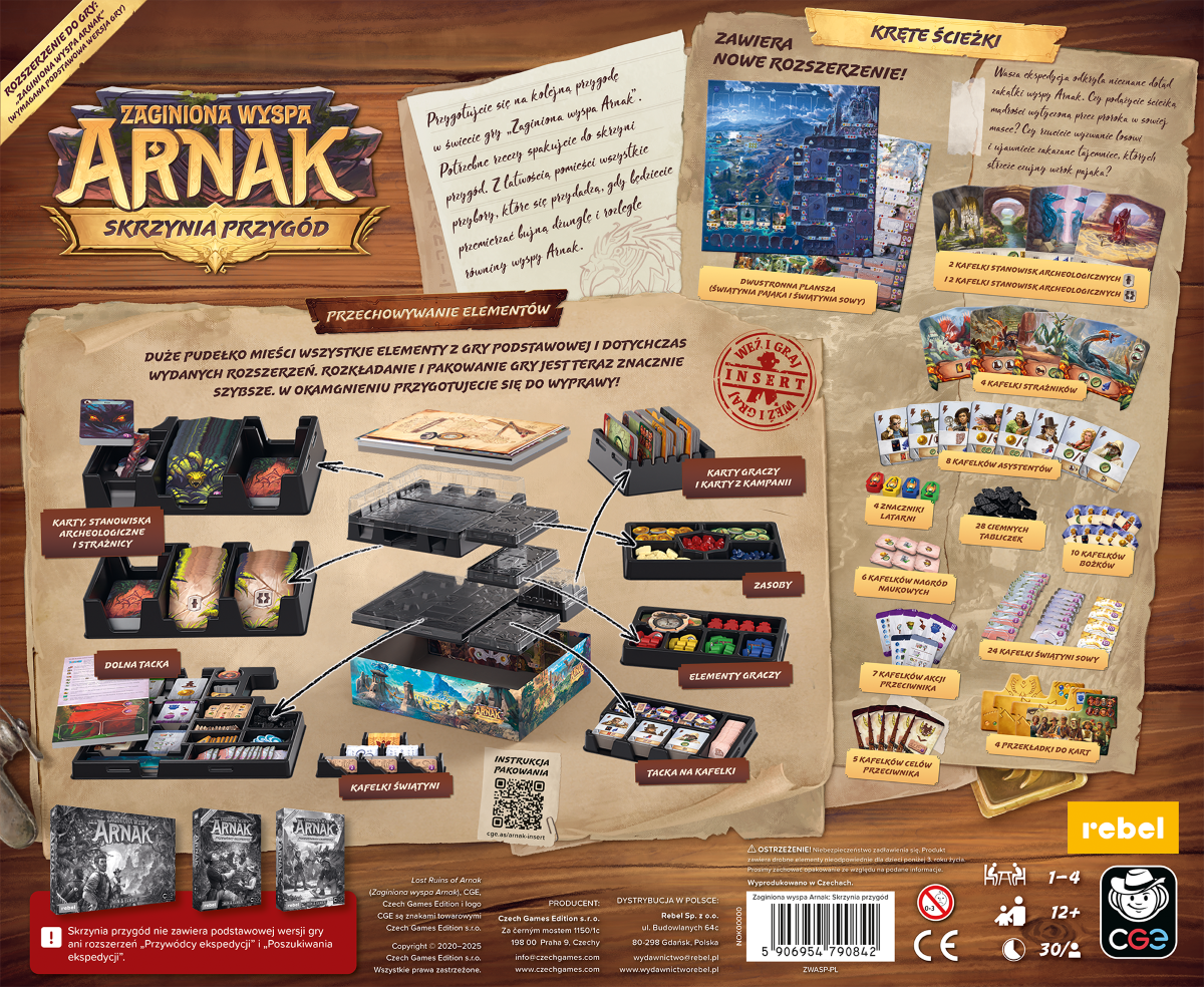 Przygotujcie się na kolejną przygodę, pakując wszystkie niezbędne rzeczy tak, by każda miała swoje bezpieczne miejsce. Zaginiona wyspa Arnak: Skrzynia przygód to niezwykle pakowne pudełko, które z powodzeniem pomieści zarówno grę podstawową, jak i dodatki. W środku znajdziecie praktyczny system przechowywania kart, kafelków, zasobów i innych elementów, dzięki któremu rozkładanie i pakowanie gry będzie znacznie szybsze.    Skrzynia skrywa też dodatek do gry: Kręte ścieżki. Pozwoli on Wam odkryć nieznane dotąd zakątki wyspy. Czy podążycie ścieżką mądrości wytyczoną przez proroka w sowiej masce? A może rzucicie wyzwanie losowi i ujawnicie zakazane tajemnice, których strzeże czujny wzrok pająka?   Czym jest Zaginiona wyspa Arnak?   To przygodowa gra łącząca mechaniki budowania talii i rozmieszczania robotników. Podczas zabawy uczestnicy eksplorują kolejne zakątki planszy i odkrywają nieznane tereny, umiejętnie zarządzając zgromadzonymi zasobami. Oprócz klasycznych efektów, dostępne karty służą też do rozmieszczania pracowników, a wraz z odkrywaniem kolejnych części wyspy, pojawiają się zupełnie nowe akcje, które będziemy mogli wykonywać. Niektóre z nich będą wymagały posiadania konkretnych zasobów, kluczowe będzie więc zbudowanie solidnej podstawy.