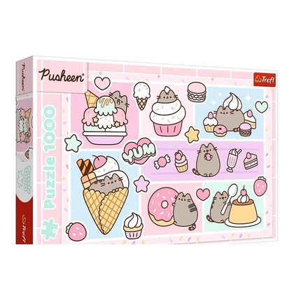 Puzzle Słodki Pusheen, składające się z 1000 elementów, przedstawiają pastelowy kolaż z Pusheen i przeróżnymi słodkościami. Po ich ułożeniu powstanie obrazek w rozmiarach 683x480 mm.