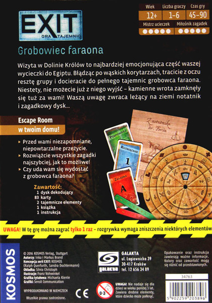 Wizyta w Dolinie Królów to najbardziej emocjonująca część Waszej wycieczki do Egiptu. Błądząc po wąskich korytarzach, tracicie z oczu resztę grupy i docieracie do pełnego tajemnic, grobowca Faraona. Niestety, nie możecie już z niego wyjść - kamienne wrota zamknęły się tuż za Wami! Waszą uwagę zwraca leżący na ziemi notatnik i zagadkowy dysk...