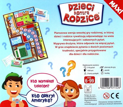 Planszowa wersja wesołej gry rodzinnej, w której dzieci i rodzice, rywalizują odpowiadając na wiele interesujących i zabawnych pytań (m.in. Kto wynalazł telefon?, Kto odkrył Amerykę?). Wygrywa drużyna, która odpowie na więcej pytań. W grze znajdziecie pytania o dwóch poziomach trudności, specjalnie przygotowane dla dzieci i rodziców.