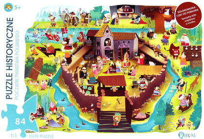 "Puzzle historyczne - Początki państwa polskiego" składają się z 84 dużych elementów, tworzących po ułożeniu ilustrację o nieregularnych kształtach o wymiarach aż 64 x 46 cm. Na pudełku znajdą Państwo legendy i informacje o ważnych wydarzeniach z początków państwa polskiego, grę ćwiczącą spostrzegawczość oraz specjalny kod, który pozwoli pobrać ze strony kolorowanki i kolejne gry utrwalające wiadomości zawarte na puzzlach.