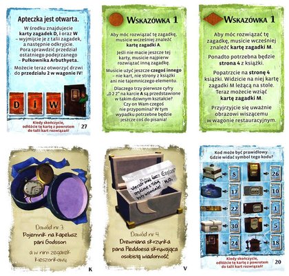 W momentach, w których skończą się Wam pomysły, a czujecie, że rozwiązanie jest tuż pod nosem możecie skorzystać z kart podpowiedzi. Do każdej zagadki w grze, przypisane są dwie podpowiedzi i karta rozwiązania. Jeśli wychodzicie z siebie, ale nie możecie przejść dalej - zamiast frustrować się dalej, możecie dobrać taką kartę, jednak ostateczny wynik będzie wtedy nieco niższy! Będziecie wycinać elementy gry, giąć, rysować po kartach, sprawdzać najbardziej nieoczywiste rozwiązania, kodować, dekodować, układać, odwracać, kolorować - ale czy uda Wam się znaleźć właściwe rozwiązanie?
