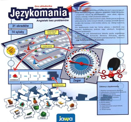 "Językomania" to gra stworzona z myślą o dzieciach, rozpoczynających swoją niezwykłą przygodę z językiem angielskim. Dzięki niej szybko i przyjemnie nauczą się podstawowych nazw ubrań, owoców, warzyw, zwierząt, mebli i przyborów szkolnych. Układając wyrazy z odpowiednich sylab, młodzi gracze przyswoją sobie pisownię wielu nowych słówek, a czytając powstałe wyrazy na głos lub tworząc z nimi krótkie zdania czy dialogi, wyćwiczą wymowę.