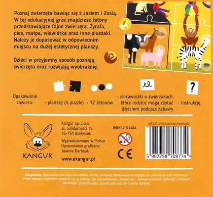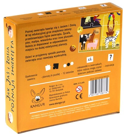 Poznaj zwierzęta bawiąc się z Jasiem i Zosią. W tej edukacyjnej grze znajdziesz żetony przedstawiające fajne zwierzęta. Żyrafa, pies, małpa, wiewiórka oraz inne pluszaki. Należy je dopasować w odpowiednim miejscu na dużej, estetycznej planszy. Dzieci w przyjemny sposób poznają zwierzęta oraz rozwijają wyobraźnię.