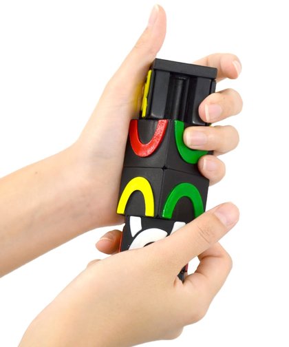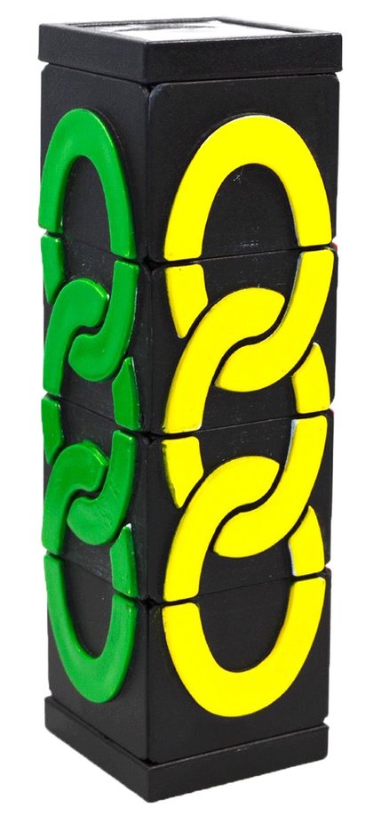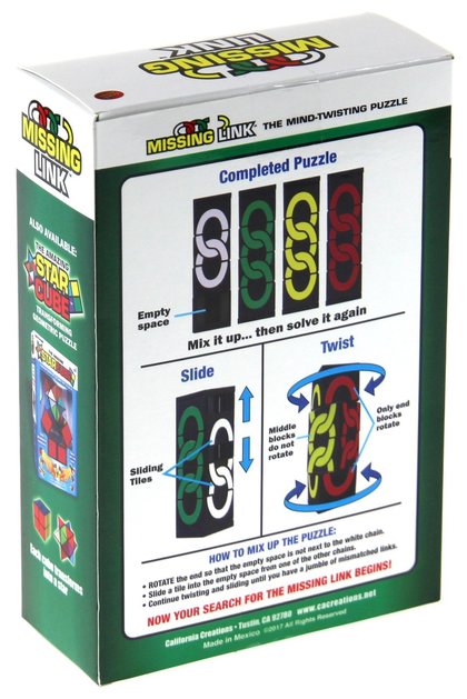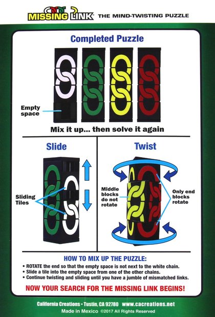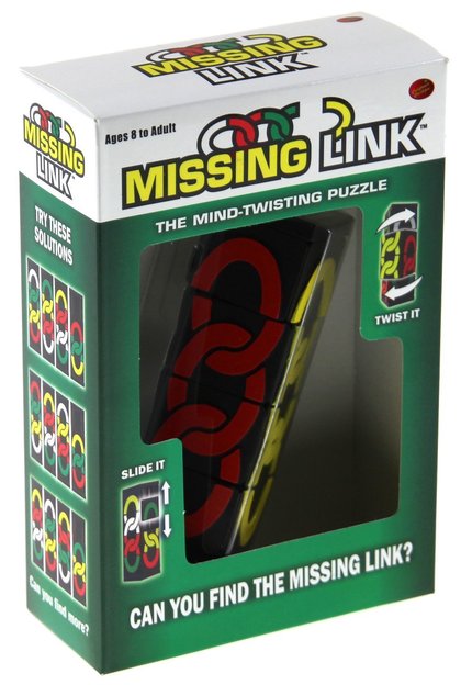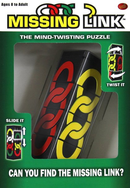 Łamigłówka Missing Link to figura na której znajdują się cztery kolorowe łańcuchy. Jeden z nich - biały - jest krótszy od pozostałych, dzięki czemu płytki mogą się przesuwać. Wymieszaj wszystkie kolory, a następnie rozwiąż łamigłówkę. Pamiętaj, że obracają się tylko bloki końcowe. Płytki z bloków środkowych można przesuwać w górę i w dół.