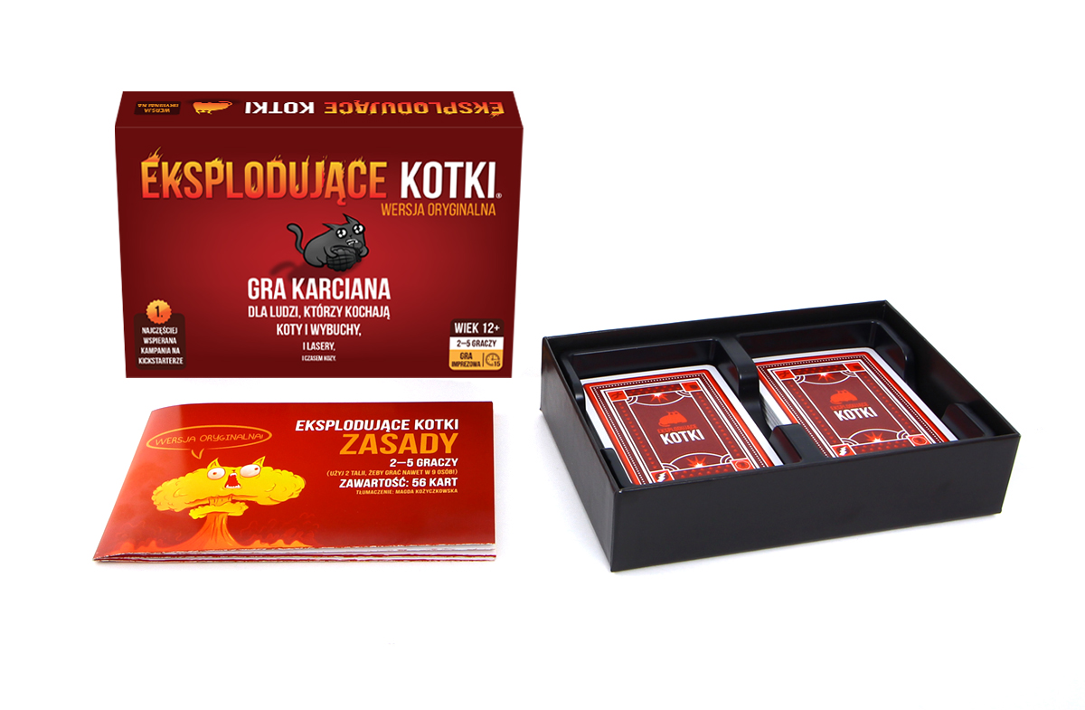 Sprawdź, na czym polega fenomen kultowej karcianki i spróbuj swoich sił w oszukiwaniu przeznaczenia! Eksplodujące Kotki to napędzana kociakami, całkowicie bezpieczna odmiana rosyjskiej ruletki. Podczas rozgrywek gracze co turę dobierają po jednej karcie, aż do momentu, gdy ktoś wyciągnie eksplodującego kotka – taki nieszczęśnik wybucha i ginie, a tym samym kończy grę. Na szczęście w talii są też karty, dzięki którym możemy odwlekać nieuniknione (a raczej przerzucić je prosto na przeciwników). Aby wygrać, musimy mądrze zarządzać kartami, które uda nam się zdobyć.