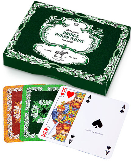 Klasyczne, bardzo popularne, najwyższej jakości karty do gry austriackiej firmy Piatnik. Idealne do brydża, pokera, remika oraz innych gier. Jakość i tradycja w doskonałej cenie!