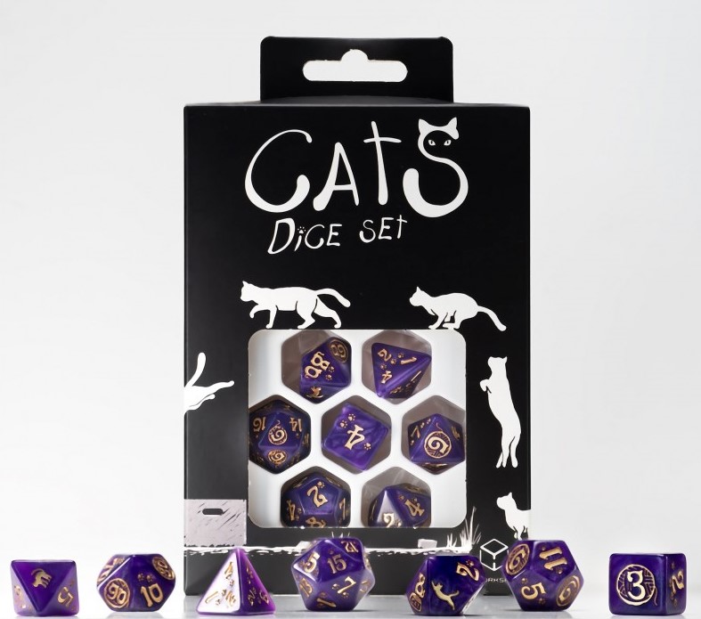 Koci Zestaw Kości: Purrito jest niezwykły nie tylko dlatego, że zadedykowaliśmy go naszym futrzastym władcom ekhm, towarzyszom. Przede wszystkim każda kostka jest inna - na najwyższej ściance są koty oddające się swoim kocim rozrywkom. Dodatkowo niektóre ścianki pokazują jedną z ich ulubionych rzeczy: miskę karmy lub kulkę włóczki! Kiedy się przyjrzysz, zobaczysz także ślady kocich łapek - bo kto im zabroni chodzić po czymś świeżo malowanym?   Im więcej, tym weselej - zestaw zawiera 7 elementów: K4, K6, K8, K10, K12, K20 i K00. Lśniąca sierść, złote oczy - tło kostek ma kolor lśniącej purpury, podczas gdy zdobienia są koloru złotego. Kocie sprawy - najwyższe ścianki pokazują sylwetki kotów w różnych ustawieniach, inne dla każdej kostki. Ulubione zabawki - na ściankach oprócz wyraźnych cyfr widnieją także kulka włóczki i miska z karmą. Futerkowa licencja - Koci Zestaw Kości: Purrito powstał na licencji udzielonej przez koci odcisk zamoczonej w atramencie łapki na odpowiednim dokumencie.