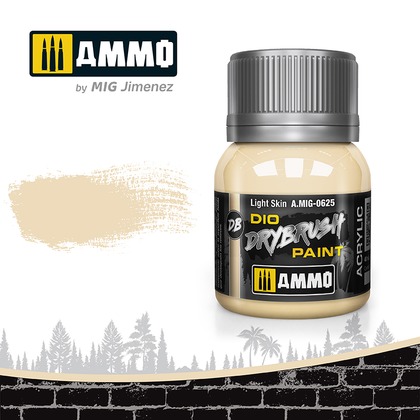Drybrushing (technika suchego pędzla) to technika modelarska stosowana od dziesięcioleci, nadająca głębi i przestrzenności naszym modelom, podkreślając różne tekstury i detale. Jest to wszechstronna, uniwersalna i łatwa w użyciu metoda pozwalająca uzyskać przekonujący, autentyczny efekt w kilku ruchach.   AMMO: DIO Drybrush to nowa formuła farb specjalnych do drybrushingu. Farby z tej serii cechują się idealną gęstością, wysoką jakością i specyficznymi właściwościami, które czynią je najlepszymi produktami do tej techniki. Słoiczki farb posiadają bardzo szeroką szyjkę, która ułatwia nabieranie farby. Farba stworzona jest na bazie wody, jest łatwa w czyszczeniu, nietoksyczna i bezwonna. Farby wysychają bardzo szybko, modele po pomalowaniu można dotknąć w przeciągu kilku minut. Są odporne na zmywanie olejem.     Produkty Ammo of Mig Jimenez to doskonałe narzędzia dla pasjonatów, znajdziesz tutaj wszystko, czego potrzebujesz do tworzenia niesamowicie realistycznych efektów na swoich modelach i figurkach.