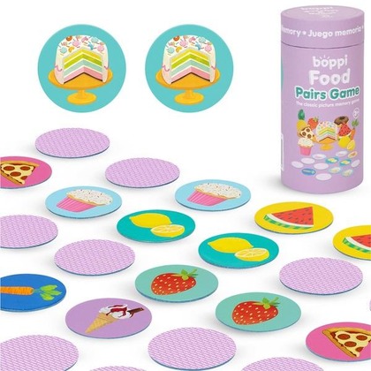 Boppi, układanka w pary memo Jedzenie to wspaniała, edukacyjna gra memo. Super sprawdzi się także w podróży. Gra ćwiczy koncentrację i pamięć oraz logiczne myślenie. Dzieci muszą starać się zapamiętać gdzie były odkładane karty z ilustracjami owoców, warzyw i różnych smakołyków, aby potem jak najszybciej znaleźć właściwą parę.