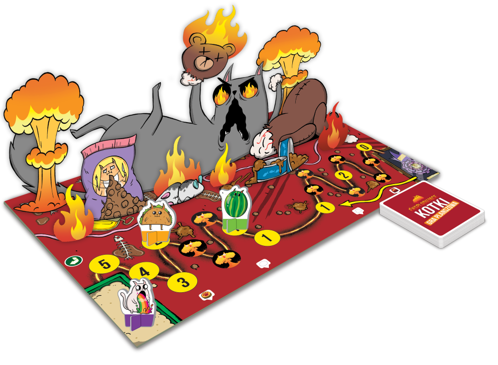 Jedna z najlepiej sprzedających się gier karcianych wszech czasów jest teraz planszówką i to taką, jakie świat jeszcze nie widział! Eksplodujące Kotki: Gra planszowa to nowa wersja imprezowego hitu, w którym próbujemy odnaleźć się w zmiennej sytuacji i zastawiać przemyślane pułapki na przyjaciół. Znajdziemy tu zarówno znajome efekty, jak i zupełnie nowe rozwiązania, a wybuchnięcie może okazać się całkiem kuszącą opcją Na czym to polega? Podczas rozgrywek naszym celem jest zakończenie ruchu dokładnie na polu ze wstążką. Wydawać by się mogło, że do pokonania mamy niewielki odcinek, ale wszechobecne pułapki i przeciwnicy będą nam skutecznie utrudniali planowanie. Gracze kolejno rozgrywają swoje tury w ramach identycznego schematu: najpierw zagrywamy dowolną liczbę kart akcji z ręki, a potem dobieramy dysk ruchu i go rozpatrujemy. O ile talia kart nie stanowi zagrożenia i jest pełna przydatnych efektów, o tyle dyski ruchu potrafią nieźle namieszać w naszych planach. Skoro gra ma w nazwie eksplodujące kotki, nie powinno dziwić, że udział w niej wiąże się z ryzykiem wybuchnięcia. Jeśli trafimy na pole ze znajomą pułapką, musimy zagrać kartę rozbrojenia. W przeciwnym razie eksplozja wyrzuci nas prosto do kuwety (czyli na pole startowe). Jeszcze Wam mało? Dodajmy, że plansza jest dwustronna w trybie spokoju czekają na nas tylko 3 eksplodujące kotki, jednak w trybie chaosu jest ich aż 9! Na szczęście mamy pewną kontrolę nad tym, czy i kiedy zmieniamy stronę podobnie jak pozostali gracze, którzy z pewnością będą chcieli zrobić nam na złość. Dlaczego pokochasz tę grę? Fani Eksplodujących Kotków z pewnością docenią charakterystyczny humor, obejmujący zarówno teksty na kartach, jak i ilustracje. Poczują się też pewniej widząc znajome efekty, nawet jeśli tym razem będą ich używać w nieco innym celu. Jednocześnie gra jest na tyle zmodyfikowana, że będzie interesująca nawet dla weteranów serii. W planszowej wersji unikanie wybuchnięcia nie jest naszym głównym celem (ba, czasem może nawet okazać się przydatne!), musimy więc przyjąć zupełnie inną strategię. Podczas rozgrywek nie zabraknie jednak najważniejszego: negatywnej interakcji! Praktycznie każdy element gry, od efektów kart, poprzez dyski ruchu, aż po odwracanie planszy, można wykorzystać, by uprzykrzyć życie kolejnemu graczowi.