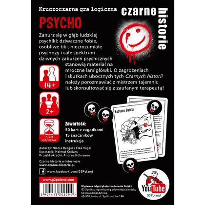 Zanurz się w głąb ludzkiej psychiki: dziwaczne fobie, osobliwe tiki, niezrozumiałe psychozy i całe spektrum dziwnych zaburzeń psychicznych stanowią materiał na mroczne łamigłówki. O zagrożeniach i skutkach ubocznych tych Czarnych historii należy porozmawiać z mistrzem tajemnic lub skonsultować się z zaufanym terapeutą!