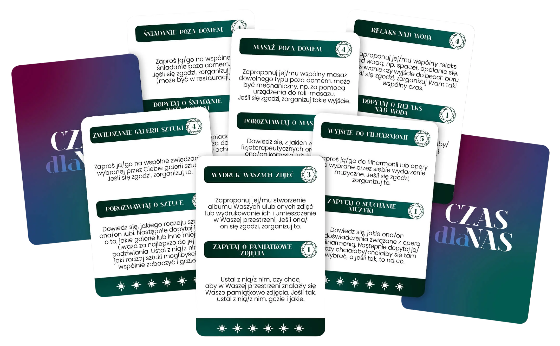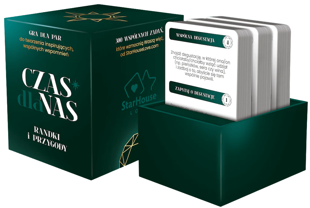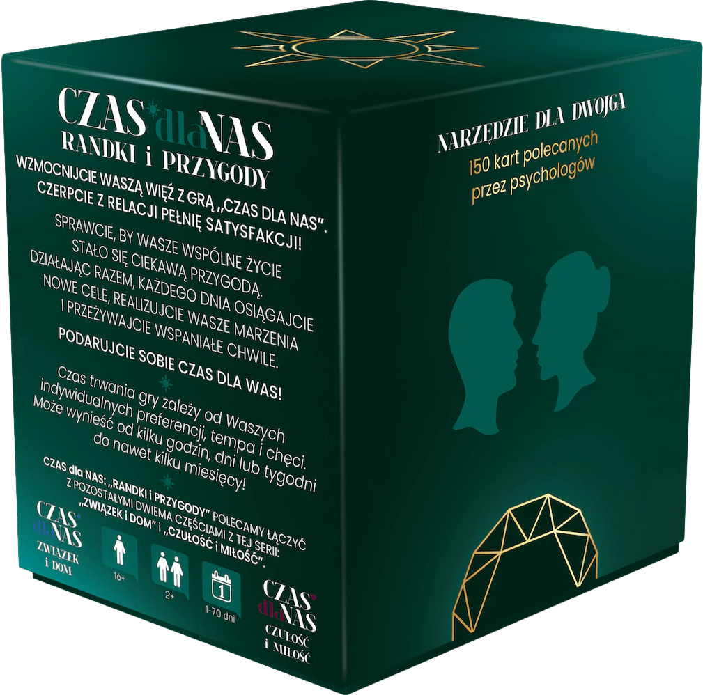 Pragniecie spędzać ze sobą jeszcze więcej czasu, który dostarczy Wam pozytywnych emocji? Chcecie robić wspólnie więcej rozmaitych rzeczy i tworzyć wspomnienia, które zostaną w Waszej pamięci na długo? Czas wzajemnie zmotywować się do działania i spróbować nowych aktywności! Gra Czas dla nas: Randki i przygody zachęci Was do opuszczania domu i aktywniejszego spędzania czasu na wiele rozmaitych sposobów!   Świat ma Wam do zaoferowania niezapomniane doznania, wyjątkowe wyzwania, odkrywanie nieznanych Wam zakątków, czy spontaniczne powroty do miejsc i aktywności, które uwielbiacie. Ta gra zachęci Was do opuszczania domu i aktywniejszego spędzania czasu na wiele rozmaitych sposobów!   Czas dla nas to rewolucyjna seria gier dla dwojga, która zapewni Wam rozrywkę na kilka dni, tygodni, a nawet miesięcy! Jak to możliwe? Pudełko zawiera 150, przygotowanych przez psychologów, unikalnych zadań i wyzwań, spośród których każdego dnia spróbujecie wykonać chociażby jedno!   Gra karciana Czas dla nas: Randki i przygody:   Wyzwoli w Was więcej energii do działania poprzez angażujące zadania. Pomoże Wam w poszukiwaniu nowych ciekawych aktywności i zajęć. Zmotywuje Was do wspólnego odkrywania nowych, ciekawych miejsc. Wskaże Wam to, co Was łączy i pomoże odkryć to, czego pragniecie razem doświadczać. Zainspiruje Was do wzajemnego inspirowania się. motywowania i partnerskiego współdziałania. Wzmocni w Was otwartość na bogactwo i różnorodność wrażeń, które świat ma Wam do zaoferowania. Utwierdzi w Was chęć przeżywania przygód i czerpania z nich emocji.