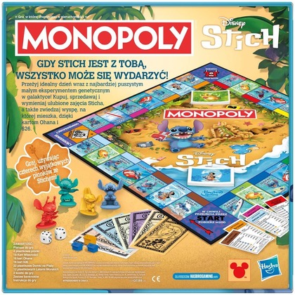 Przeżyj idealny dzień wraz z najbardziej puszystym małym eksperymentem genetycznym w galaktyce! Kupuj, sprzedawaj i wymieniaj ulubione zajęcia Sticha, a także zwiedzaj wyspę, na której mieszka, dzięki kartom Ohana i 626.   Monopoly: Stich to strategiczna gra planszowa dla całej rodziny, w której klasyczne pola nieruchomości zastąpiono  aktywnościami takimi jak pokaz pływanie na desce, relaks oraz czy spotkanie przy herbacie. Podczas zabawy wybieramy jeden z unikalnych pionków Sticha, a następnie rozpoczynamy poruszanie się po planszy, starając się jak najwięcej zarobić na wynajmie domków plażowych. Od tego zależy, jak atrakcyjny będzie nasz dzień spędzony ze Stichem - i jak wysoki czynsz będziemy mogli pobrać od innych graczy!