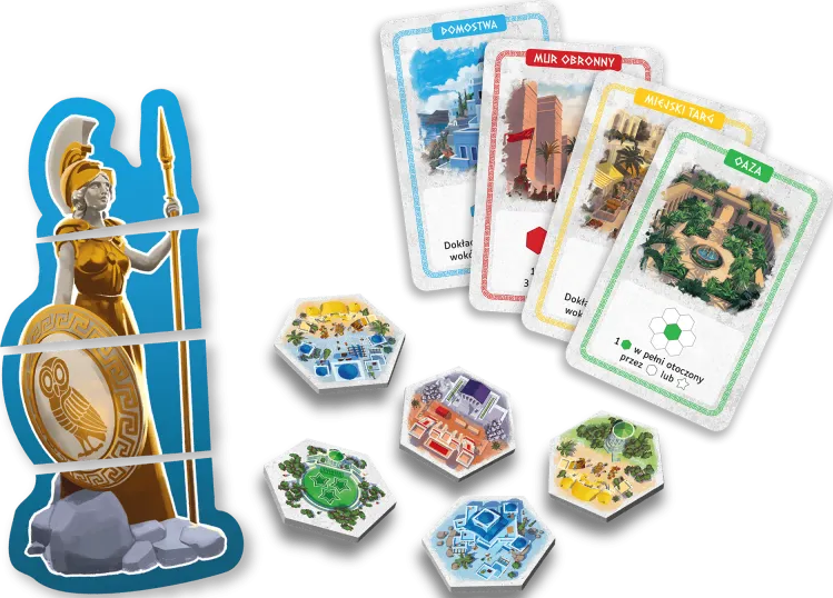 Na wybrzeżach Morza Śródziemnego wrze zawzięta rywalizacja pomiędzy miastami łaknącymi bogactw i chwały. Wiara w moc Ateny, potężnej bogini wiedzy, wojny i artystów, pcha architektów do tworzenia wspaniałych budowli. Każdy liczy, że to właśnie jemu łaska Ateny pozwoli zabłysnąć na kartach historii. Tylko Twoje umiejętności dadzą Ci przewagę w tym wiekopomnym zadaniu. Pamiętaj: od tego zależy przyszłość Twoja i Twojego miasta!   Akropolis: Atena wprowadza nowe wyzwanie w postaci kart budowli. Gracze będą starali się spełnić wymogi karty budowli, tworząc określone układy kafli w swoich miastach. Jeśli to im się uda, zdobędą kolejne części posągu Ateny i małe kafle, które ulepszą ich miasta oraz dadzą dodatkowe punkty na koniec gry.