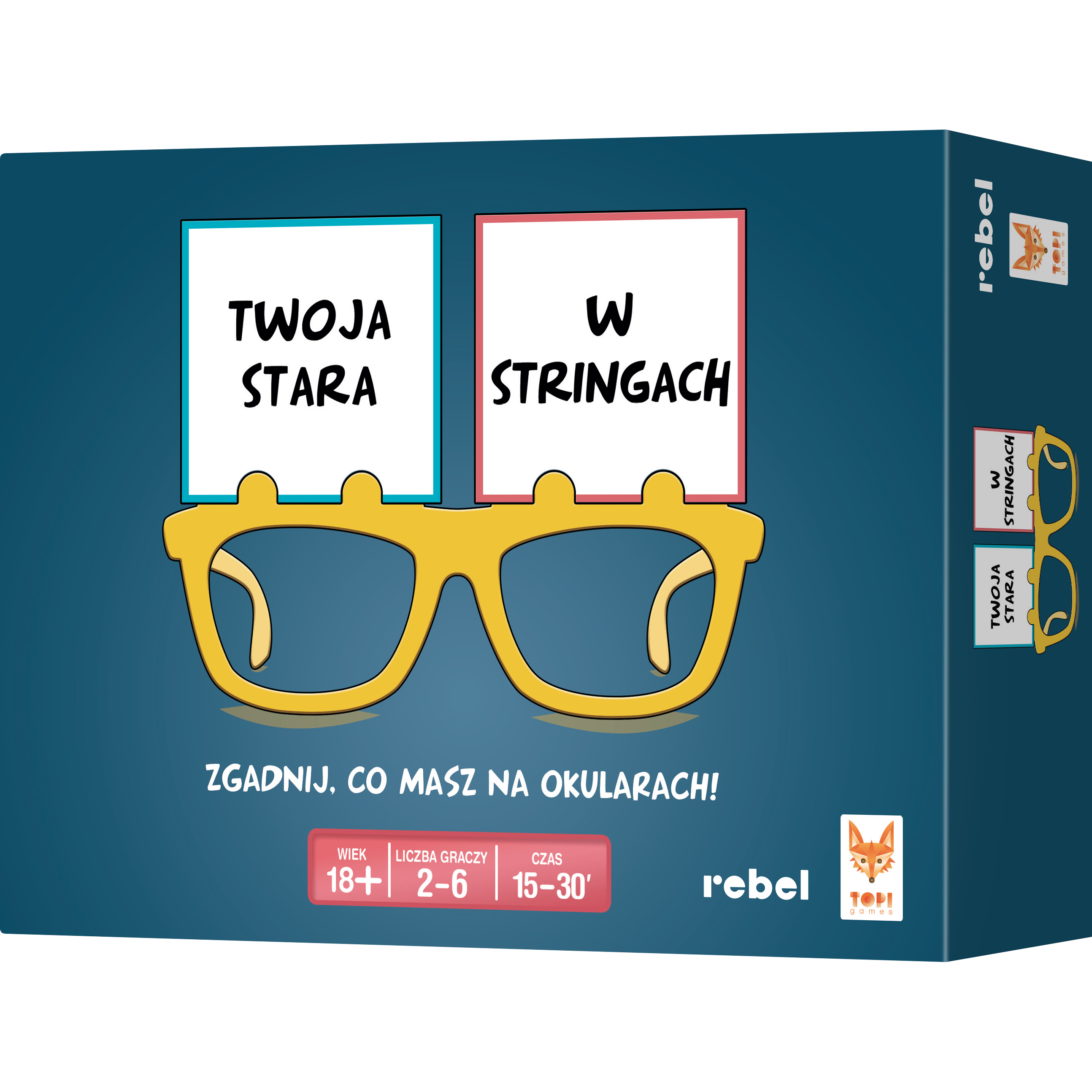Kim jesteśmy? Skąd pochodzimy? Dokąd zmierzamy? Okulary z tego pudełka odpowiedzą Ci najwyżej na to pierwsze pytanie w końcu to tylko gra imprezowa. Na szczęście dwa kolejne możesz rozkminić z co bardziej filozoficzną częścią towarzystwa w kuchni o czwartej nad ranem. Ale wcześniej zagrajcie w naszą grę! Twoja stara w stringach to dedukcyjna karcianka, w której próbujemy odgadnąć, kim jesteśmy i co robimy lub w jakich okolicznościach się znajdujemy. Maria Skłodowska-Curie robi pazurki, Krzysztof Krawczyk pisze maturę, Shrek walczy w KSW Do odgadnięcia są setki kombinacji! Wetknij 2 karty w oksy i zadawaj pytania, na które można odpowiedzieć tylko tak lub nie. Spróbuj znaleźć rozwiązanie zanim przeciwnicy odkryją własne tożsamości! Na czym to polega? W grze występują 2 rodzaje kart: na niebieskich znajdziemy postacie, a na różowych czynności, miejsca lub okoliczności, w jakich się znajdują. Każdy z graczy otrzymuje po 1 karcie z obu talii, a następnie umieszcza karty swojego sąsiada na jego okularach tak, by sąsiad nie widział, co znajduje się na jego kartach. Wszyscy zakładają swoje oksy i zaczynamy zabawę! Pojedyncza tura gracza trwa 30 sekund. W tym czasie zadajemy jak najwięcej pytań, które pozwolą nam ustalić, co mamy na swoich kartach. Pozostali odpowiadają na bieżąco, a my w każdym momencie możemy spróbować odgadnąć hasło lub hasła. Zwycięży osoba, która jako pierwsza odgadnie treść obu swoich kart to od Was zależy, czy musi podać ją słowo w słowo, czy dopuszczalne są odstępstwa. Grajcie dalej, póki nie zostanie tylko jedna osoba. Przegrany na pocieszenie będzie mógł rozpocząć kolejną rundę! Dlaczego pokochasz tę grę? Jeszcze zanim zaczniecie, czeka Was masa śmiechu to nie są okulary, w których człowiek wygląda inteligentnie, a kombinacje na kartach z pewnością Was zaskoczą. Podobnie jak próby pozostałych, by odgadnąć, kim są. Zasady można wytłumaczyć w kilka chwil, a poręczne pudełko pozwala zabrać grę, gdzie tylko zamarzycie. Do rozgrywki nie potrzebujecie też zbyt wiele miejsca, więc możecie bawić się w każdych okolicznościach. Tylko uważajcie w miejscach publicznych, bo część haseł jest zdecydowanie 18+! W pudełku czeka na Was 50 kart postaci i tyle samo kart sytuacji to mnóstwo kombinacji do odgadnięcia! Jakby tego było mało, do dyspozycji macie aż 24 puste karty, które możecie wykorzystać do stworzenia własnych haseł.