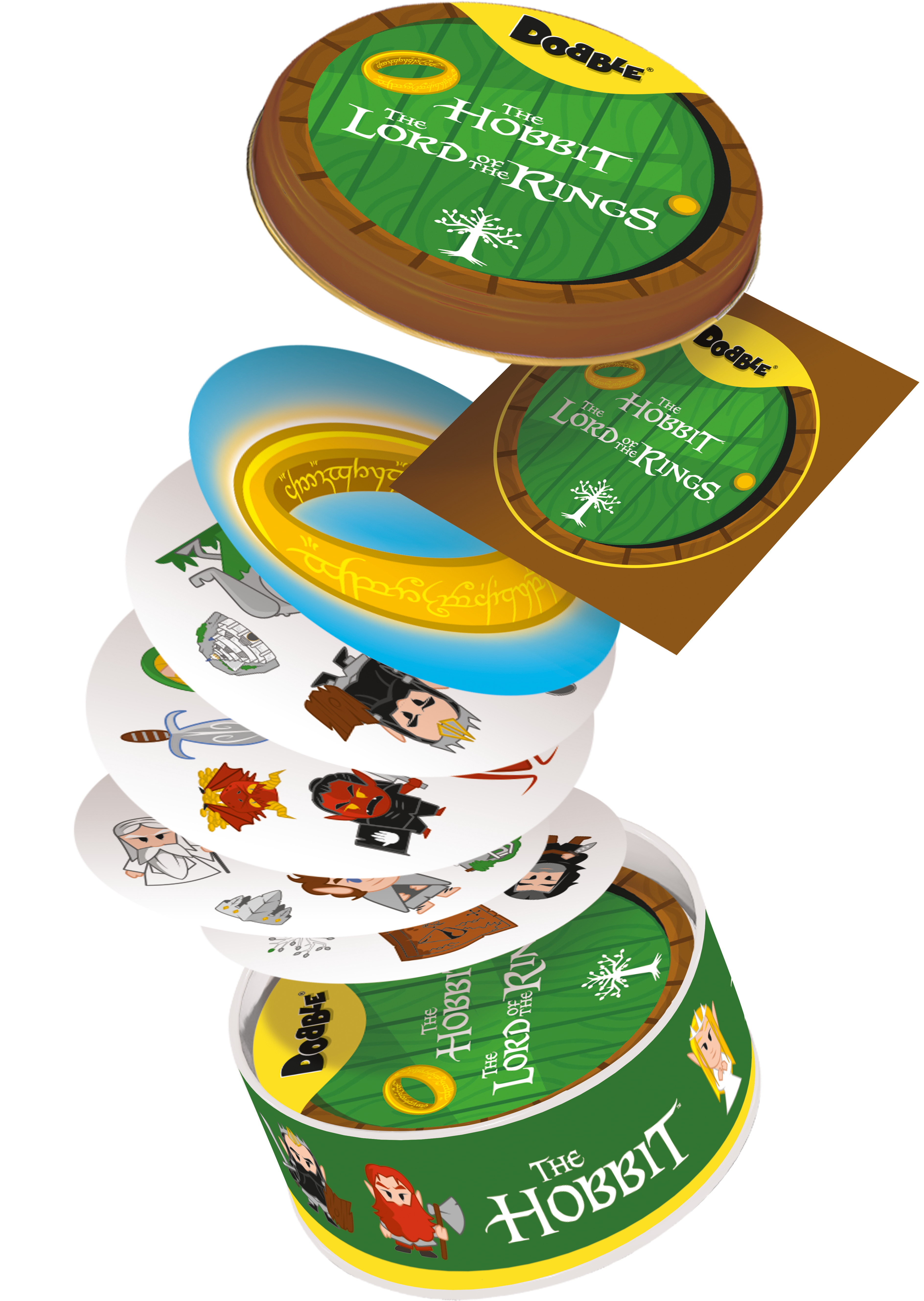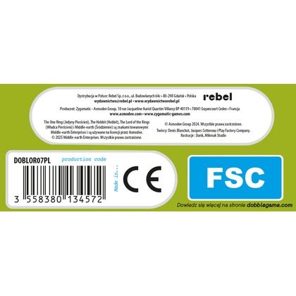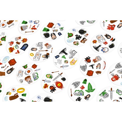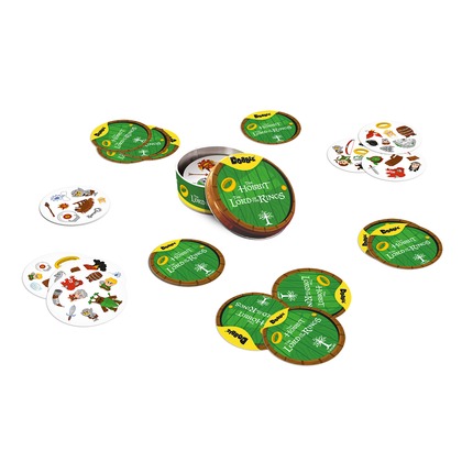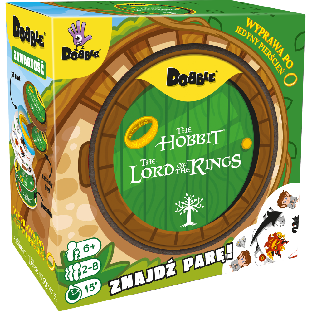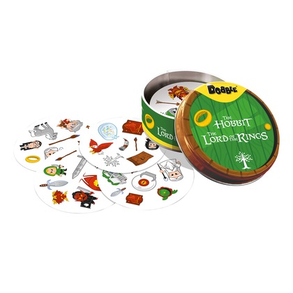 Zabierz Froda, Sama, Gandalfa oraz Smauga gdzie tylko zechcesz i baw się, szukając par w popularnej grze towarzyskiej! Spójrz na pierwszą kartę, którą trzymasz w ręku oraz na tę, która leży na środku stołu. Znajdź na nich wspólny symbol, nazwij go i szybko pozbądź się swojej karty. Teraz następna! Tylko nie zwątp, dwie karty zawsze łączy dokładnie jeden wspólny obrazek! W Dobble można grać na wiele sposobów, a 5 z nich jest opisanych w instrukcji jako minigry. W jednej z nich możesz nawet zostać Powiernikiem Pierścienia! Dodatkowo, aby utrudnić zabawę, symbole bywają odwrócone i miewają różne rozmiary. Same karty są okrągłe i kolorowe, a każda z nich ma unikalny zestaw symboli związanych ze światem Hobbita i Władcy Pierścieni. Dlaczego pokochasz tę grę? Przyjrzyj się obrazkom, znajdź parę, przejdź do kolejnej karty. Wydaje się proste, prawda? Ale pary nie są tak oczywiste: obrazki na kartach są różnej wielkości, odwrócone, a przede wszystkim otoczone zupełnie innymi grafikami, co potrafi zmylić nawet najbardziej spostrzegawczych graczy! Żadna inna gra nie rozrusza towarzystwa tak jak Dobble. Żadna nie jest tak prosta i nie daje tyle zabawy w ciągu tych kilku minut! Rozgrywka jest bardzo szybka, emocjonująca, a przy stole dużo się dzieje, gdy każdy próbuje wyprzedzić innych uczestników w wyścigu do zwycięstwa. Poza tym: Tylko Dobble tłumaczy się w minutę! Gra ukryta jest w solidnej, metalowej puszce, która z powodzeniem wytrzyma transport gdzie tylko zapragniemy. Okrągłe, solidne karty są bardzo wygodne podczas zabawy, nawet dla niewielkich dziecięcych rączek. Dzięki nawiązaniu do świata Hobbita i Władcy Pierścieni gra jest świetną propozycją dla małych i dużych fanów, którzy z radością szukają swoich ulubionych bohaterów.