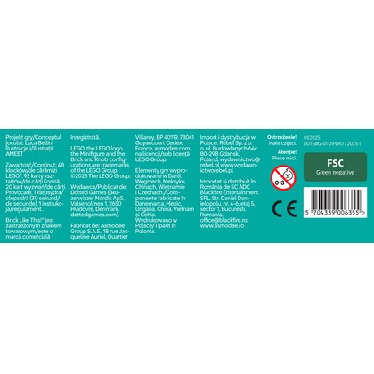 Budowanie z klocków LEGO nie ma przed Tobą tajemnic? Chcesz kreatywnie spędzić czas z rodziną? A może szukasz intrygującej i zabawnej gry imprezowej? LEGO Brick Like This to coś dla Ciebie! W tej dynamicznej grze towarzyskiej dzielimy się na drużyny, które w tym samym czasie próbują jak najszybciej złożyć z klocków kształt wskazany na karcie. Podczas gdy jedna osoba opisuje, co widzi przed sobą, druga stara się zbudować odpowiedni model LEGO. A jeśli takie zadanie jest za proste, czekają na Ciebie specjalne karty wyzwań, które jeszcze bardziej podkręcą zabawę! Na czym to polega? Uczestnicy dzielą się na dwuosobowe drużyny. Każda z nich decyduje, kto w pierwszej rundzie będzie instruktorem (osobą opisującą model), a kto budowniczym. Gra toczy się przez 6 rund, podczas których wszystkie drużyny działają równocześnie. Każda runda zaczyna się od wybrania karty kształtu. Występują one w 4 rodzajach i są ponumerowane od 5 do 8. Im wyższa wartość, tym więcej klocków składa się na dany model, a więc rośnie poziom trudności. Liczba wskazuje też, ile punktów zdobędziemy, jeśli uda nam się poprawnie zbudować model. Gdy wszyscy mają już swoje karty, instruktorzy odwracają je i rozpoczynają udzielanie wskazówek budowniczym. Gracze mogą rozmawiać, ale nie mogą wskazywać palcami. Ponadto tylko budowniczy może dotykać klocków. Gracz, który uważa, że jego drużyna skończyła swój model, krzyczy Koniec! i obraca klepsydrę, żeby wywrzeć presję na pozostałych drużynach. Rywale mają 30 sekund, żeby ukończyć budowę swoich modeli. Gdy skończy się czas i wszystkie drużyny przestaną budować, sprawdzamy, komu udało się poprawnie ukończyć model. Te pary zatrzymują swoje karty kształtów. Zwycięży drużyna, która po 6 rundach zgromadzi najwięcej punktów. Dlaczego pokochasz tę grę? To dynamiczna i angażująca gra, która świetnie sprawdzi się zarówno w rodzinnym gronie, jak i na imprezach dorosłych. Zasady są łatwe do wytłumaczenia, możliwość spróbowania swoich sił w dwóch różnych rolach jest ciekawym wyzwaniem, a presja czasu dodaje rozgrywkom emocji. Rozpoznawanie, z jakich klocków składa się dany kształt, pozwala rozwijać wyobraźnię przestrzenną, a budując modele najmłodsi gracze mogą ćwiczyć motorykę małą. Instrukcja opisuje też specjalny wariant 10-minutowego wyzwania, doskonały do rozgrywek 3-osobowych i zabawy z dziećmi. A jeśli zwykłe budowanie wydaje się zbyt łatwe, w pudełku czekają też specjalne karty wyzwań z kreatywnymi ograniczeniami dla instruktorów i budowniczych!