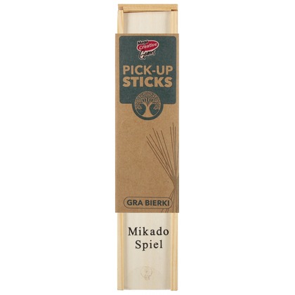 Zasady gry: chwyć w dłoń wszystkie bierki, otwórz dłoń tak aby wszystkie się rozsypały, zadaniem jest zebrać jak najwięcej patyczków, zabierając je jeden po drugim tak aby nie poruszyć innego bierka, jeśli poruszysz zabierając bierkę inne bierki, automatycznie tracisz kolejkę i grę kolejny z graczy. Gra wykonana z drewna. Zawartość zestawu: gra bierki.