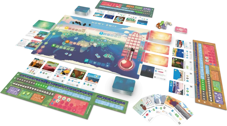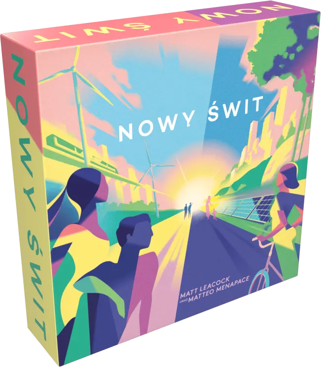 Los planety jest w Waszych rękach. Twórzcie nowoczesne technologie i społeczeństwa, które stawią czoła zagrożeniom globalnego ocieplenia. W trakcie gry będziecie tworzyć stosy kart z potężnymi kombinacjami symboli i efektów. Czy uda Wam się opracować skuteczne strategie redukcji emisji gazów cieplarnianych?   Nowy świt to w pełni kooperacyjna gra, w której wygrywacie lub przegrywacie razem!   Gra została zaprojektowana przez Matta Leacocka, twórcę hitowej gry "Pandemic", oraz Matteo Menapace'a. Pudełko jest wypełnione po brzegi ekologicznymi komponentami zawierającymi setki oryginalnych ilustracji artystów z całego świata. Gra w 2024 roku zdobyła prestiżową nagrodę Kennerspiel des Jahres.