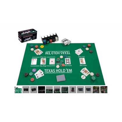 Zestaw do pokera zawiera matę do gry, dwie talie kart, 200 żetonów, dealer button, small i big blind oraz zasady gry. Zestaw jest dostarczany w blaszanym pudełku.