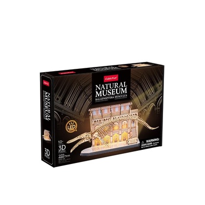 CUBIC FUN PUZZLE 3D ukazujące muzeum wraz z dużym szkieletem Płetwala Błękitnego podświetlonym światłem LED. W opakowaniu znajdują się 223 puzzle, wykonanych ze specjalnego materiału przypominającego piankę. Puzzle są ponumerowane, ponacinane i umieszczone na arkuszach. Wystarczy bez użycia siły wycisnąć element z arkusza i zmontować go zgodnie z dołączoną instrukcją, bez użycia kleju ani specjalnych narzędzi. Wielkość budowli po złożeniu to 58x20,5x37,5 cm.