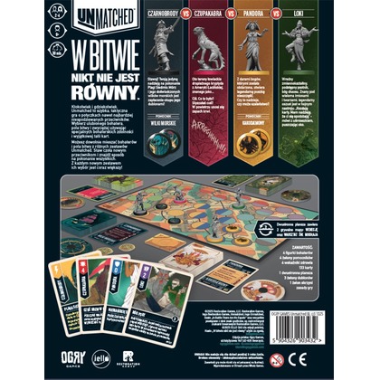 Unmatched to gra figurkowa o pojedynkach postaci z różnych krain i epok, od herosów znanych z mitów i legend, do bohaterów książek i filmów. Każdy z nich dysponuje własną talią kart, która wyraża jego wyjątkowy styl walki. Możesz mieszać i zestawiać bohaterów z dowolnych zestawów Unmatched, ale pamiętaj: ostatecznie zwyciężyć może tylko jeden!   Bohaterowie dostępni w tym zestawie: Czarnobrody - charyzmatyczny i przerażający pirat, Loki - nordycki bóg psotników, Pandora - zesłana przez bogów na ziemię z puszką pełną nieszczęść, Czupakabra - legendarny "wysysacz kóz", bezwzględny zabójca.